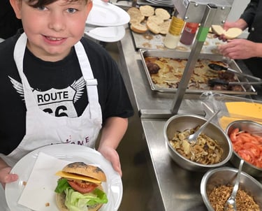 En cuisine, ils ont préparé différents ingrédients : salade, tomates et oignons, avant d’assembler de délicieux burgers maison.